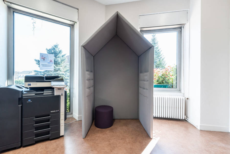 En complément, nous avons également installé une cabine Hydda, offrant des espaces privés et isolés où les membres de la communauté peuvent effectuer des appels téléphoniques ou se concentrer sur des tâches nécessitant une confidentialité accrue. Cette cabine est équipée de matériaux absorbants qui atténuent efficacement le bruit ambiant, offrant ainsi un environnement de travail confortable et serein.