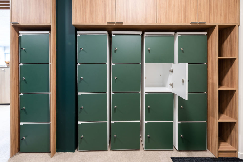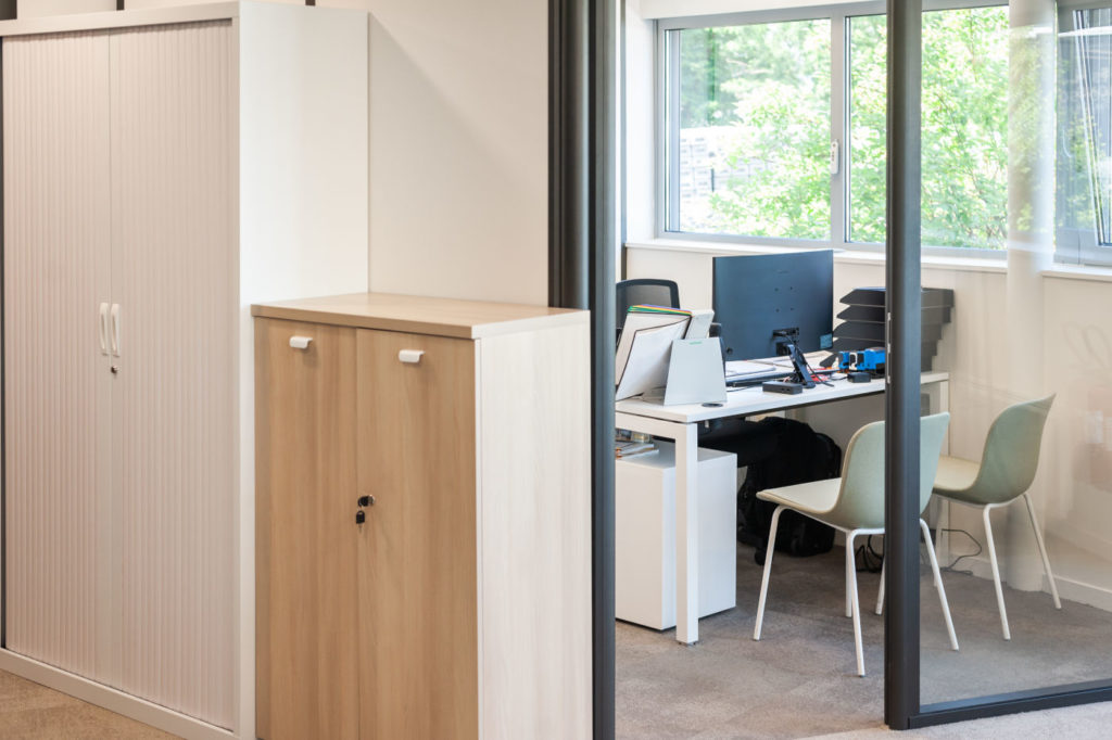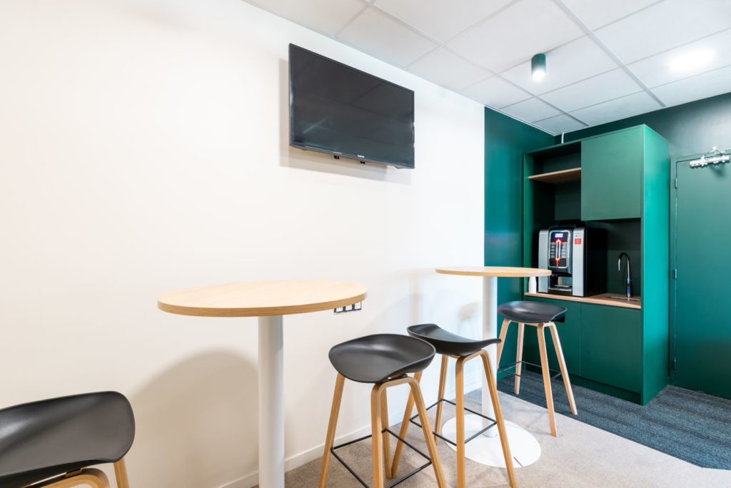 En complément, deux bulles de repli ont été intégrées pour des moments de concentration ou de réflexion en toute tranquillité. Une zone dédiée à la tisanerie/restauration offre un espace convivial pour les pauses détente, tandis qu’un espace de rangement équipé de casiers KAZE permet un rangement organisé et pratique des effets personnels.