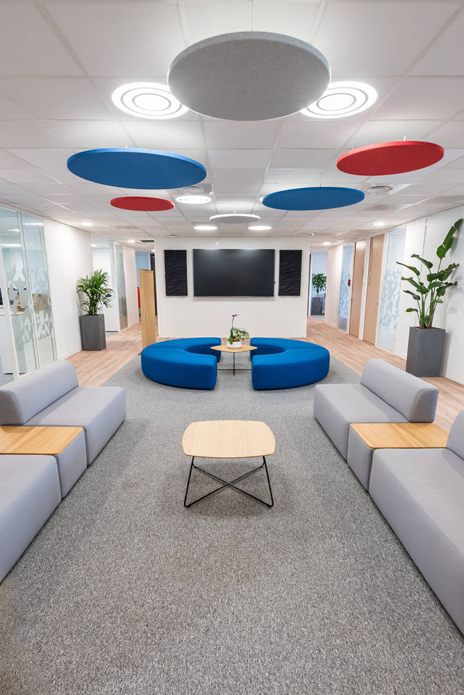 En plus de l’open space et de l’espace détente, d’autres espaces ont été équipés en mobilier de bureau pour répondre aux besoins spécifiques de l’entreprise, notamment un réfectoire, un espace de communication, une salle de réunion et un espace d’accueil. En combinant un mobilier fonctionnel, esthétique et ergonomique avec des solutions acoustiques innovantes, nous avons créé un espace de travail polyvalent qui favorise le bien-être, la collaboration et la performance de l’équipe.