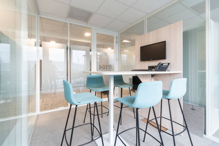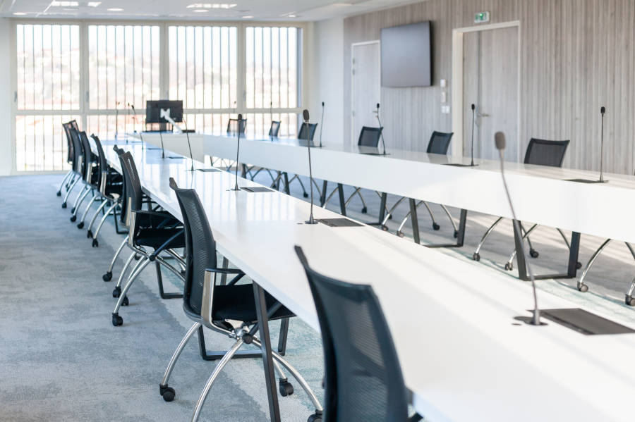 Doté de multiples salles de réunion de différentes tailles, allant de 2 à 14 places, chaque espace est équipé de prises de courant stratégiquement intégrées dans les plans de travail pour faciliter les échanges et les présentations. Une salle de conseil spécialement conçue, pouvant accueillir jusqu’à 39 personnes, se distingue par son plateau en résine V-Korr blanc et ses chants ergonomiques, complètement équipés de boîtiers-prises et de micros, répondant ainsi aux exigences spécifiques de l’équipe de l’OPAC du Rhône.